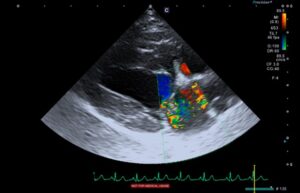 ↑ 上の写真は、犬の心臓エコー検査写真です。・■ カラフルなモザイク模様の部分がありますが、ここは僧帽弁から左心房に逆流した血流です。・■ この血流が多いと、左心房が膨らんで容積が大きくなってきます。