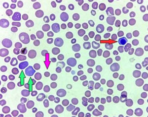 ↑ 上の写真は、免疫介在性溶血性貧血の犬の血液塗抹標本。・■ 赤血球の大きさが不均一な大小不同症と、多染性赤血球(多染性赤血球:より大きく好塩基性の未熟な赤血球;緑色の矢印)が認められる。・■ 核を持つ赤血球(赤色の矢印)も存在し、これは赤血球の再生を示唆している。・■ 球状赤血球(中心部が淡い色の小さな赤血球;ピンク色の矢印)も認められる。